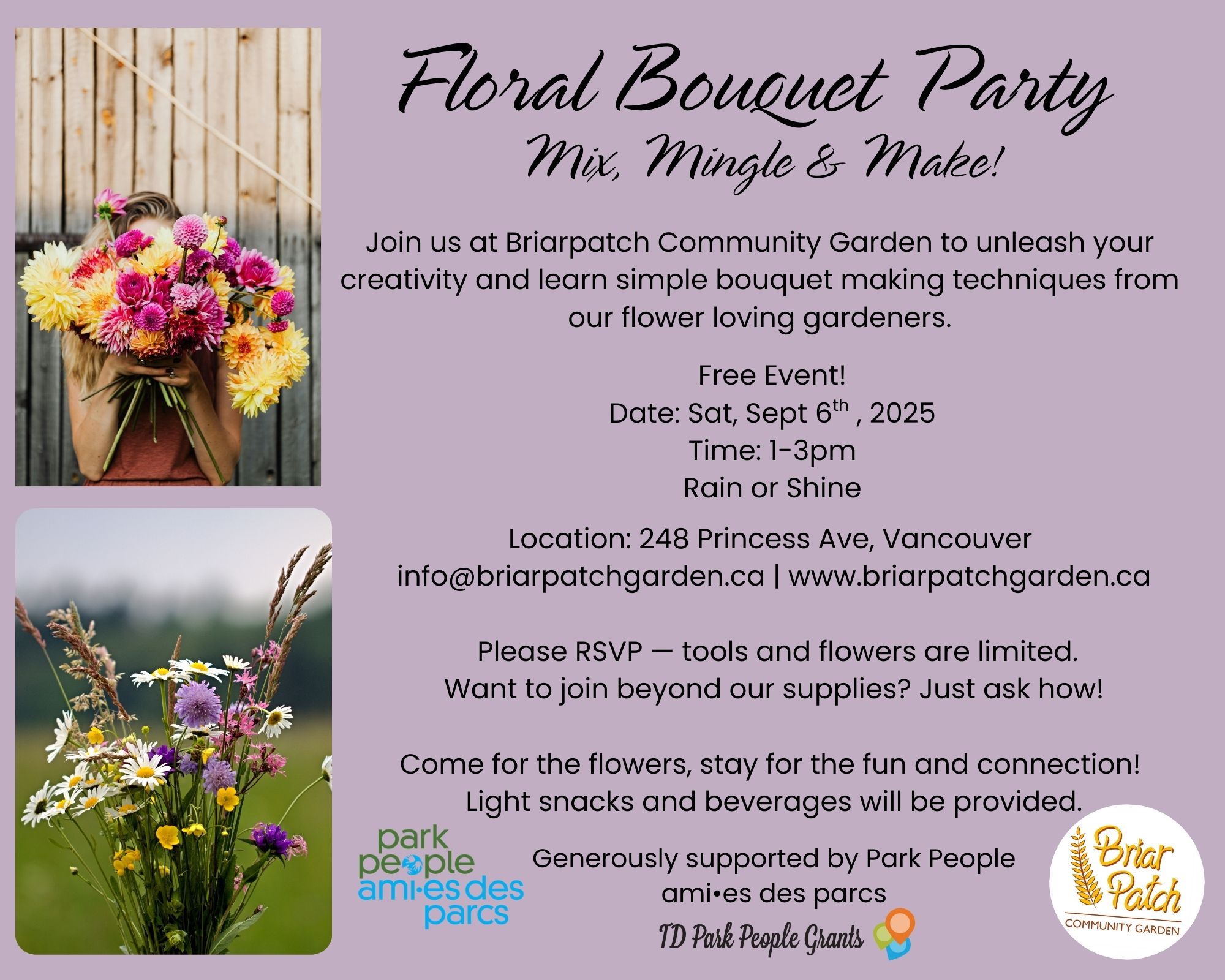 Get ready to mix, mingle, and make something beautiful! We're excited to invite you to our Floral Bouquet Party at Briarpatch Community Garden.